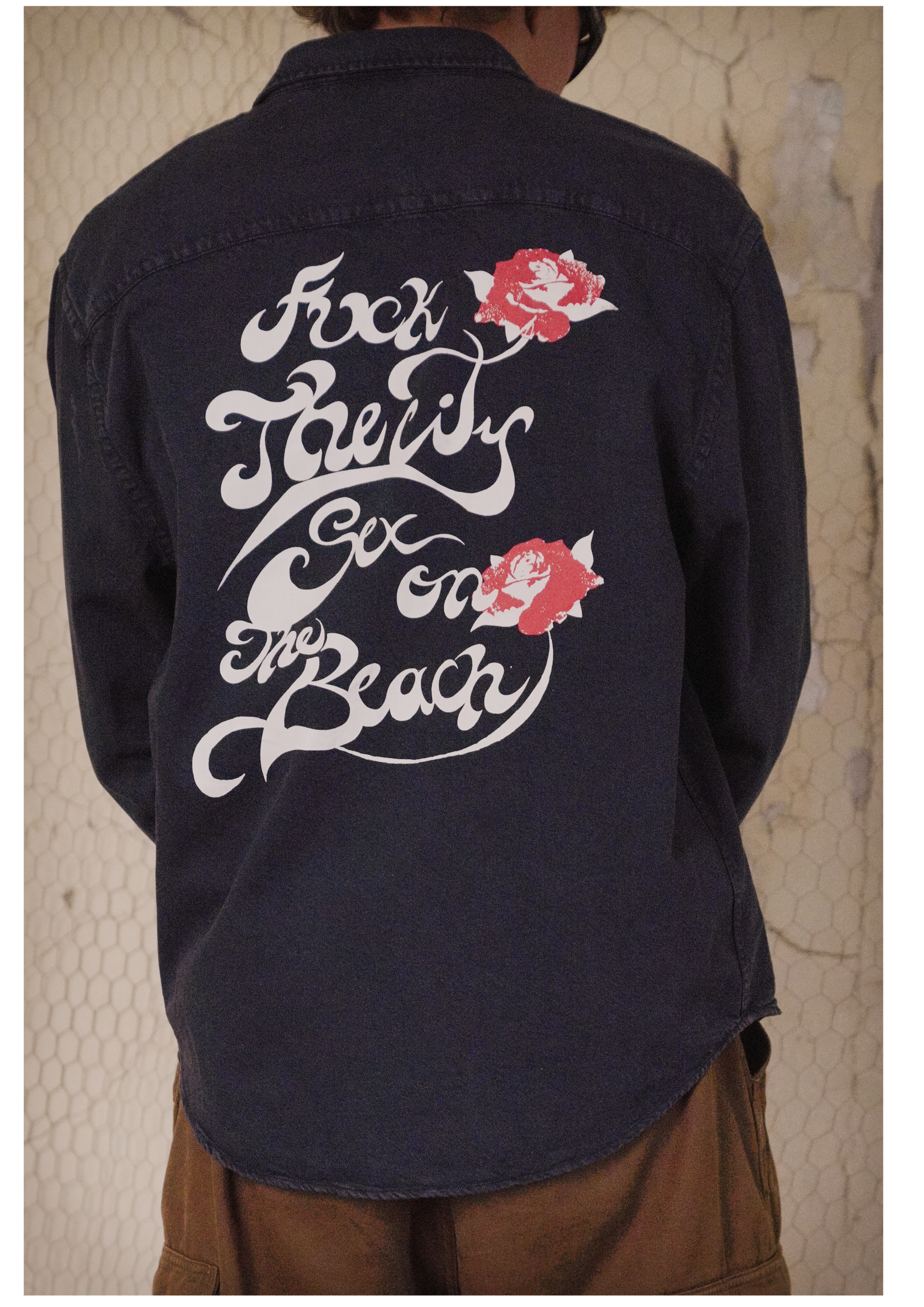 Set-in sleeves, sleeve placket with one button, cuff with two buttons, rounded cuff corners, double pleats at cuff seam, garment dyed product, each garment may vary in appearance, colour may bleed, two colour serigraphy, front and back.